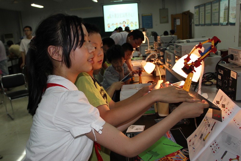 工训中心老师首先对慧鱼机器人作了简单的介绍,并讲解了制作和要领,然后两个小朋友分为一组,合作完成机器人制作任务。当孩子们看到一个个机器人模型时,好奇的天性和爱玩的心理立刻展现了出来,他们在老师的指导下,团结协作,共同思考,按照步骤将零件一个个拼装起来,玩的不亦乐乎。经他们亲手组装的风车机器人,在灯光辐射到太阳能电板后产生能源,竟神奇般地转动起来,都感到非常惊喜,高兴地欢呼雀跃,激动不已。