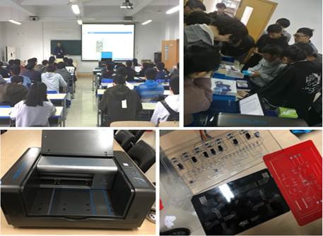 在实物演示环节,梦之墨相关技术人员给学生们现场演示了公司首创应用液态金属自固化导电墨水的高性能电子电路打印机,应用该设备可在常规办公环境下直接快速制造出液态金属电子电路。为了验证该设备的先进性,同学们还在现场工作人员讲解和指导下将自己事先准备的电路原理图进行现场打印与制作。
