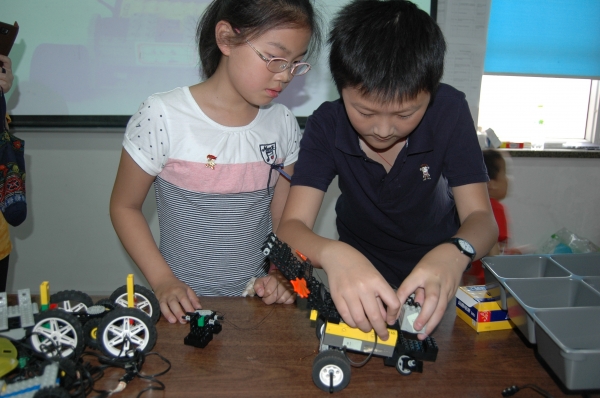 随后,2-3名小朋友为一组,在爸爸妈妈的带领和中心教师的指导下,开始创作属于他们自己的机器人。面对着一大堆机器人零件,孩子们稚嫩的小脸上闪烁着新奇、快乐的笑容,个个摩拳擦掌,跃跃欲试。功夫不负有心人,通过努力和团结协作,一个个形状各异,功能不同的机器人在他们的手中诞生了。在老师的帮助下,将电脑上的程序下载到了机器人的大脑里面,机器人就动起来了,看到动起来的机器人,小朋友们别提有多开心啦。整个活动都洋溢着活力、渗透着快乐、充满着亲情。不但是孩子们玩得开心,家长们仿佛也回到了童年时代,和孩子们一起玩得不亦乐乎。