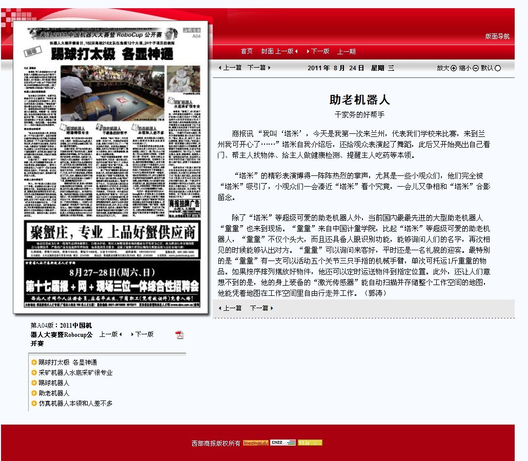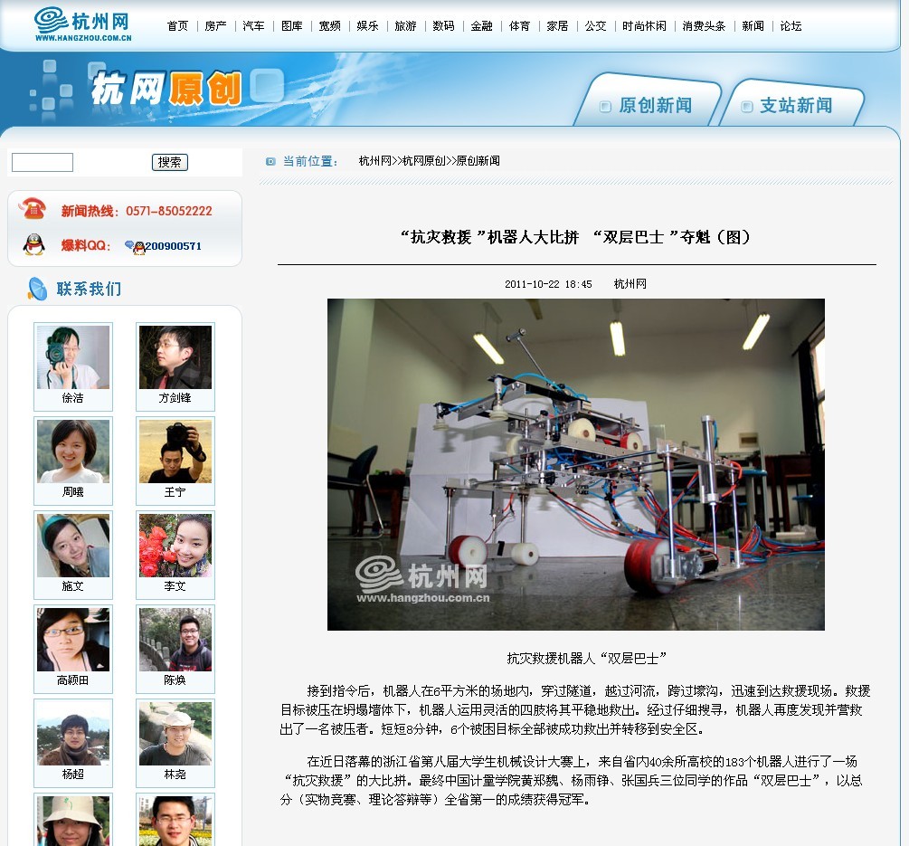 光明日报、浙江日报、杭州日报、教育信息报等多种媒体,针对实训基地建设成就、实践能力培养业绩、学生科技活动特色等主题,正面报道45次。其中浙江日报这样写道:“作为中国计量学院培养学生创新精神与实践能力的一个重要基地,工程训练中心不断深化教学改革,创新实践教学体系,使学生工程素质与专业素质的培养做到完美的结合,走出了一条集教学、训练和创新能力培养为一体的新路”2010年,团队教师指导学生完成的“智能化盲人探路器”大学生创新作品获全国2个一等奖的情况再次得到了科学时报、浙江在线、杭州日报等10多家新闻媒体的连续报道。在“2011中国机器人大赛暨RoBoCuP公开赛”上,兰州电视台对由我中心老师指导学生完成的机器人“量量”的比赛过程进行了直播报道,凤凰网、新华网、中国日报、人民网等100多家新闻媒体纷纷转载报道了“量量”的相关情况。2014.6面向钱江晚报小记者团开展“大学城科技之旅——机器人设计、装配活动”,也得到了杭州日报、钱江晚报、青年时报等媒体报道,扩大了学校的影响力。2014.12浙江教育报对中国计量学院主持开发的“工程图学”课程在教育部“爱课程网”成功上线进行了报道并给与了高度的评价。
