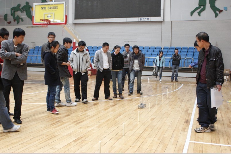 本次大赛题目为以重力势能驱动的具有方向控制功能的自行小车,分为两个项目即沿S形自动交错绕过赛道上设置的障碍物绕和沿8字形轨迹绕行相距一定距离的两个障碍,共吸引来自机电、质安、计测、量新和现科等5个学院11支参赛队伍参加最后的校决赛,参赛组除了现场小车行走成绩外,还需要向评委提供小车整体结构设计技术报告。