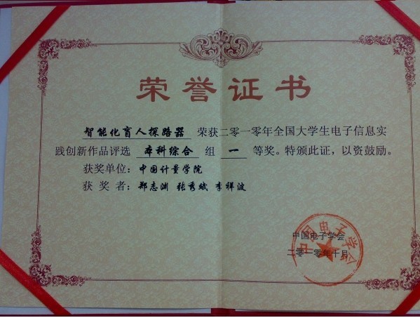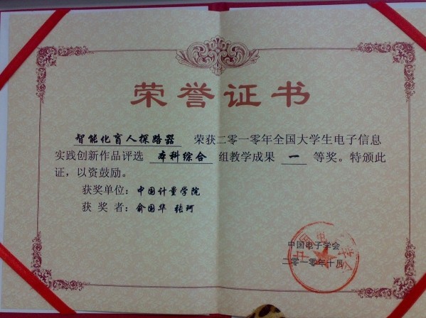 10月23-25日,由中国电子学会主办的“第三届实践教学研讨会暨首届大学生创新作品评选”在四川成都召开。本次比赛共有来自清华大学、西南交通大学、北京电子科技学院、华东理工大学在内的200余所高校的300多件大学生创新作品参加评选,经过初评、现场答辩,专家评审,我校工程训练中心俞国华、张珂老师指导的由郑智渊、张秀斌、李祥波组成的学生团队脱颖而出,其参赛作品《智能化盲人探路器》获得本科综合组一等奖,两位老师获得教学成果一等奖。