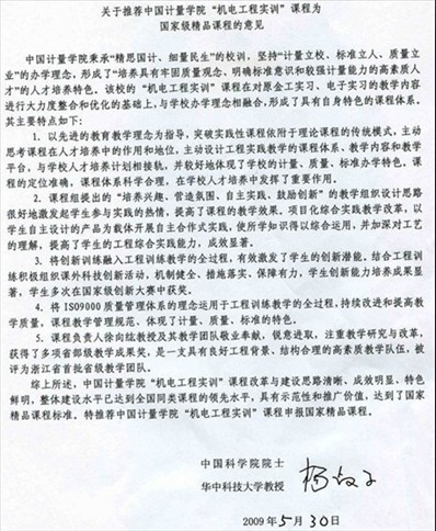 近日,华中科技大学原校长、中国科学院院士杨叔子教授给我校来信,高度评价我校的机电工程实训精品课程,并对我校在办学过程中秉承“精思国计、细量民生”的校训,坚持“计量立校、标准立人、质量立业”的办学理念,形成的人才培养特色给予肯定。认为我校的“机电工程实训”课程在对教学内容进行大力度整合和优化的基础上,与学校办学理念相融合,课程改革与建设思路清晰、成效明显、特色鲜明,整体建设水平达到全国同类课程的领先水平,具有示范性和推广价值,达到国家精品课程标准。这是对我校办学特色和课程建设成果的充分肯定,也是对我们今后工作的鞭策。