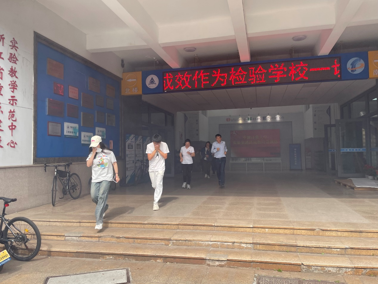 演练总指挥、实验室与资产管理处处长张志群下达指令后,预设火情在304实验室爆发。实验室安全员周乔君老师严格执行“黄金三分钟”响应机制:30秒内完成火情确认,60秒启动应急广播,90秒完成校园火警电话拨打。参演师生在南北双通道疏散组的引导下,采用“低姿捂口”标准逃生动作,3分28秒内全部撤离至安全集结点。