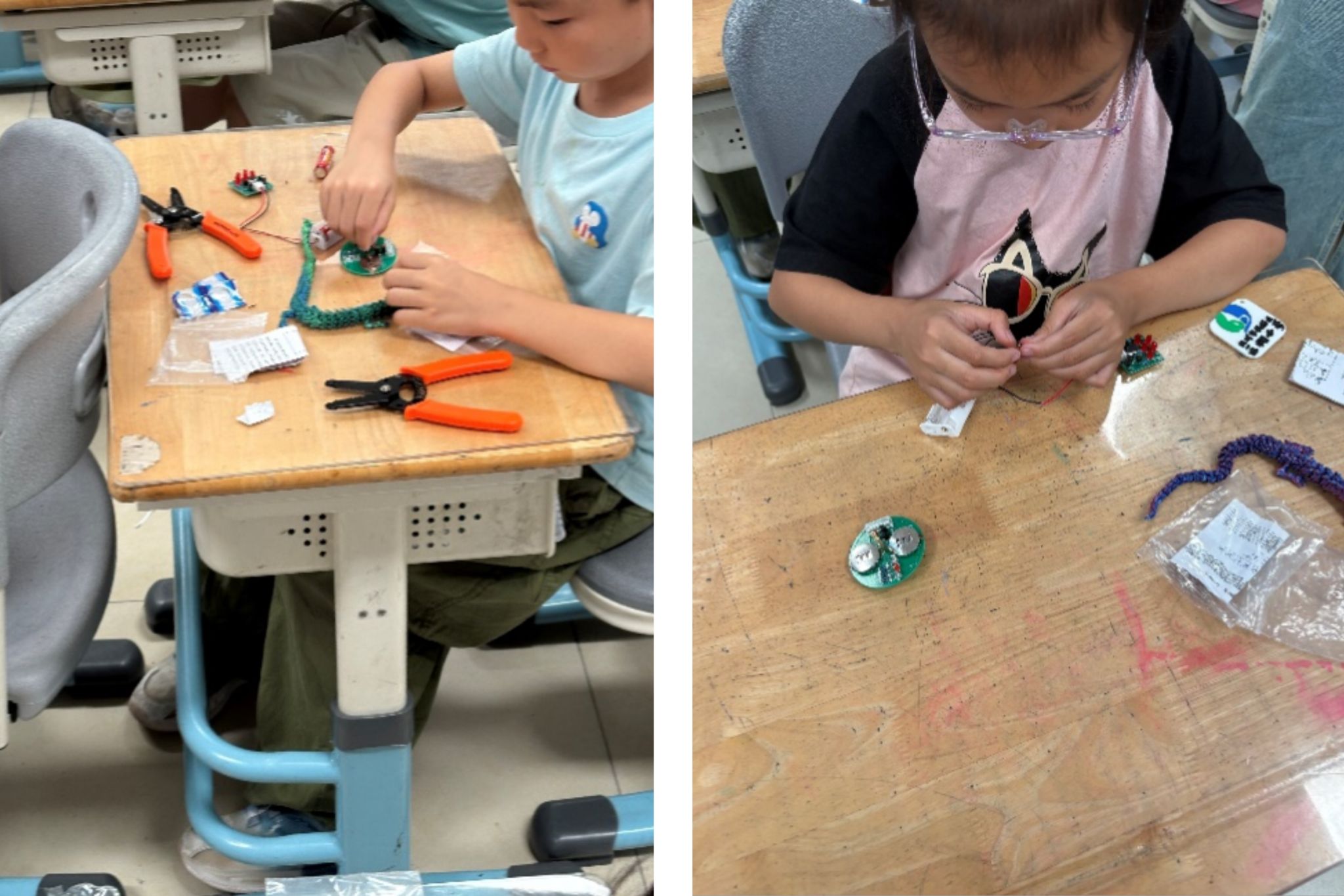 从基础电子知识普及开始,教师通过生动地讲解和实验,向学生们介绍用电基础知识。随后,孩子们在老师的指导下,亲手制作了“电子陀螺”和“麦克风声控灯”。闪烁的LED陀螺让孩子们直观理解电路闭合原理,而声控灯则通过声音传感器实现灯光控制,让抽象的科学知识变得触手可及。
